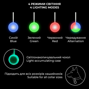 Має 4 режими освітлення. Завдяки малій вазі (13 г) та невеликому розміру (75х37х14 мм) підходить для всіх тварин.