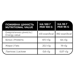 Поживні речовини: протеїн 67,1%, жири 20,1%, лактоза 0,6%.